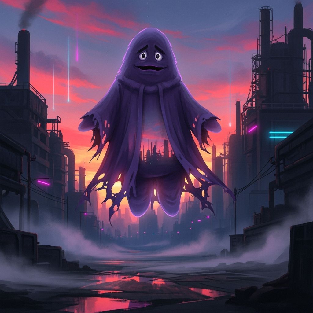 This image shows Grimace as a ghostly figure floating in a desolate urban landscape. The digital artwork features vibrant colors and a haunting atmosphere in a dreamlike style, with industrial elements.