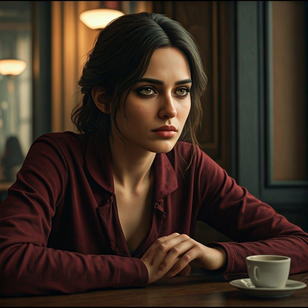 This image shows a young woman with brunette hair and dark green eyes sitting alone in a café. The cinematic shot captures an atmospheric and dramatic scene.