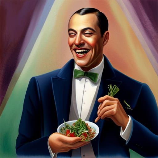 This image shows Rudolph Valentino laughing while eating salad. The hyperrealistic portrait features intricate details, a colorful background, and dramatic lighting.
