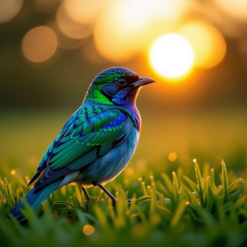 This image shows a vibrant bird with emerald feathers on green grass during sunset. It's a holographic astral cosmic illustration with mixed-media elements, featuring otherworldly colors and patterns inspired by visionary art.