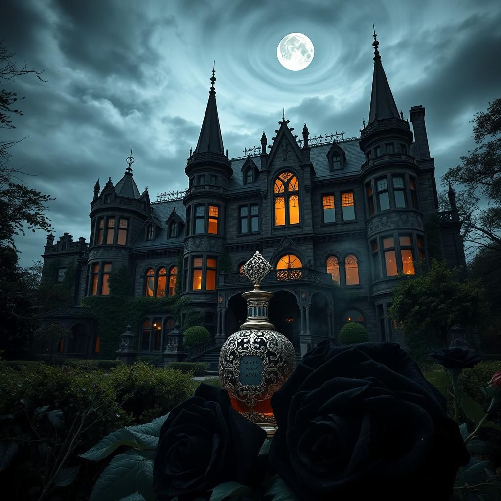 A dark, mysterious Victorian manor at night, with tall, shadowy windows and flickering candlelight. Outside, the landscape is moody and windswept, with stormy skies and an overgrown garden. Inside, a rich, romantic perfume bottle sits on an antique vanity, surrounded by dark roses, deep red velvet, and ...
