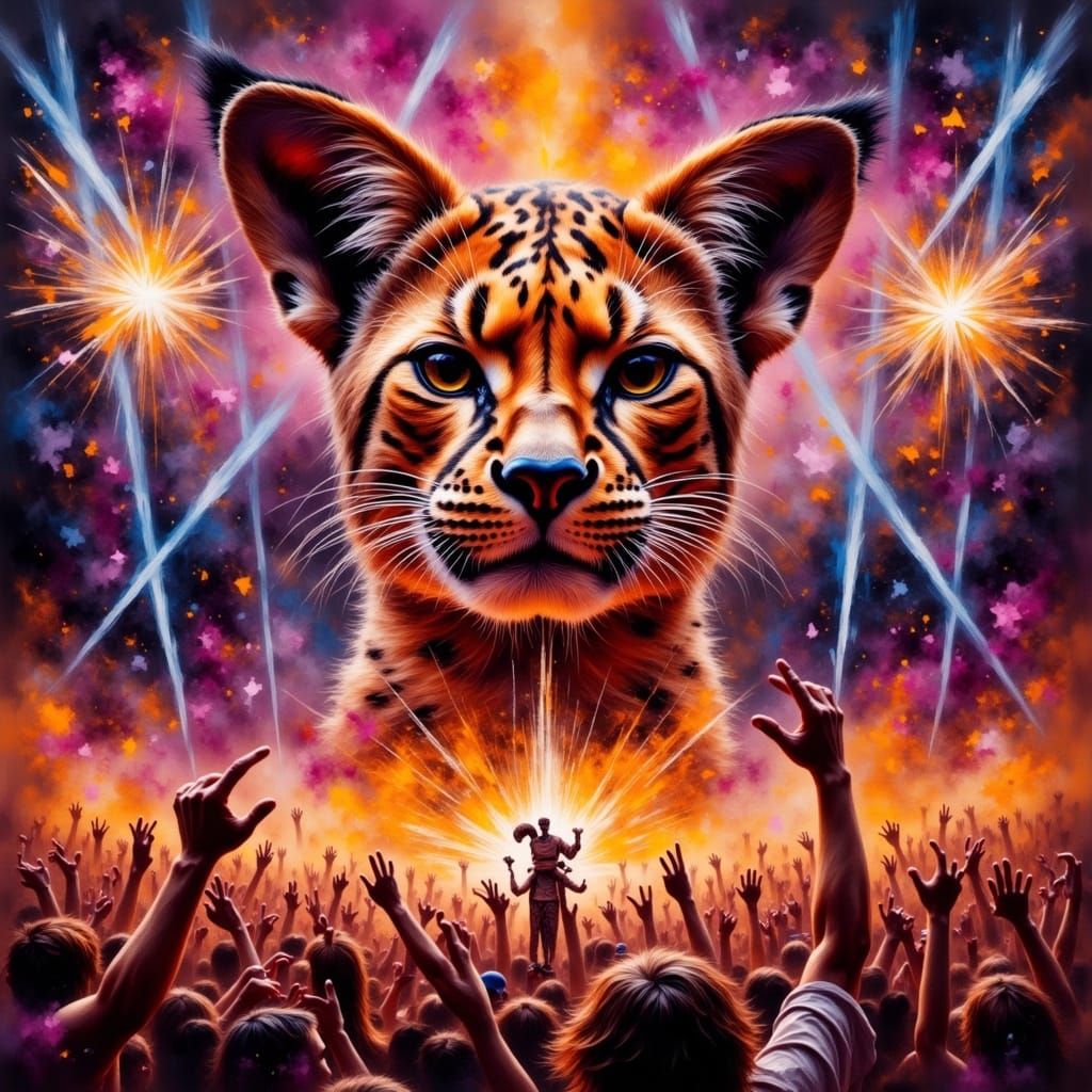 This image shows a surreal double exposure of a massive airbrushed stage band shaped like a caracal floating above an ecstatic audience. The scene is rendered in a fantastical airbrushed style with warm colors.