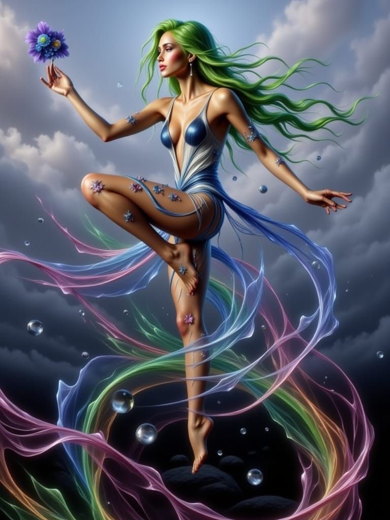 This enchanting image depicts a beautiful woman with vibrant green hair flowing in the sky, surrounded by stones and rocks, with a soft focus and airy brushstrokes that evoke a sense of whimsy and wonder.