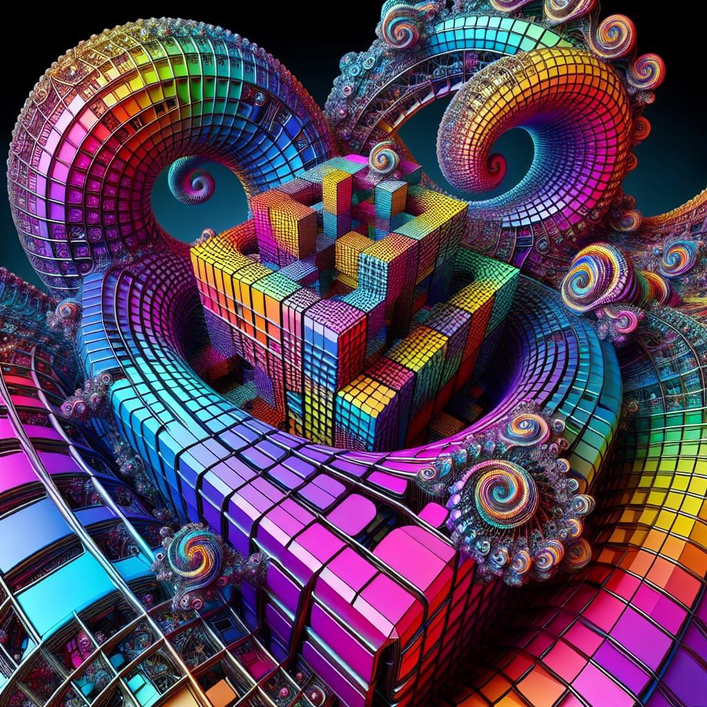 Generate a 3D Maximalist art piece using bright bismuth chrome colors. The art should convey a sense of Abstract Surrealism, featuring elements such as a twisted wireframe shape reminiscent of a Jerusalem Cube, an enchanted looking Sierpinski Gasket Fractal, and a Peano Curve Fractal interconnected in ...