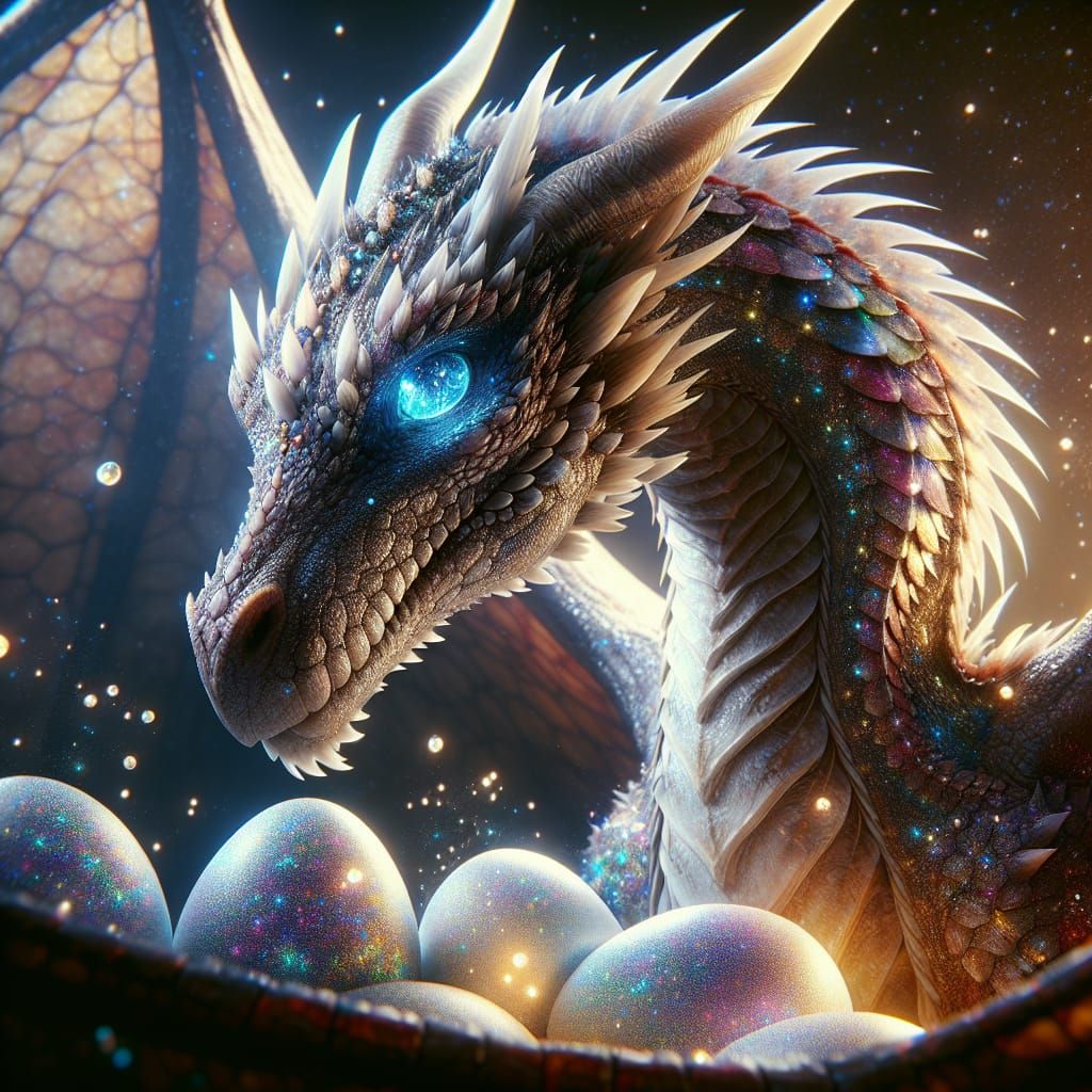 A breathtaking image of a white, diamond-scaled dragon protectively guarding her shimmering eggs. The detailed portrait features dynamic lighting and a vivid triadic color scheme, rendered as 8K concept art.