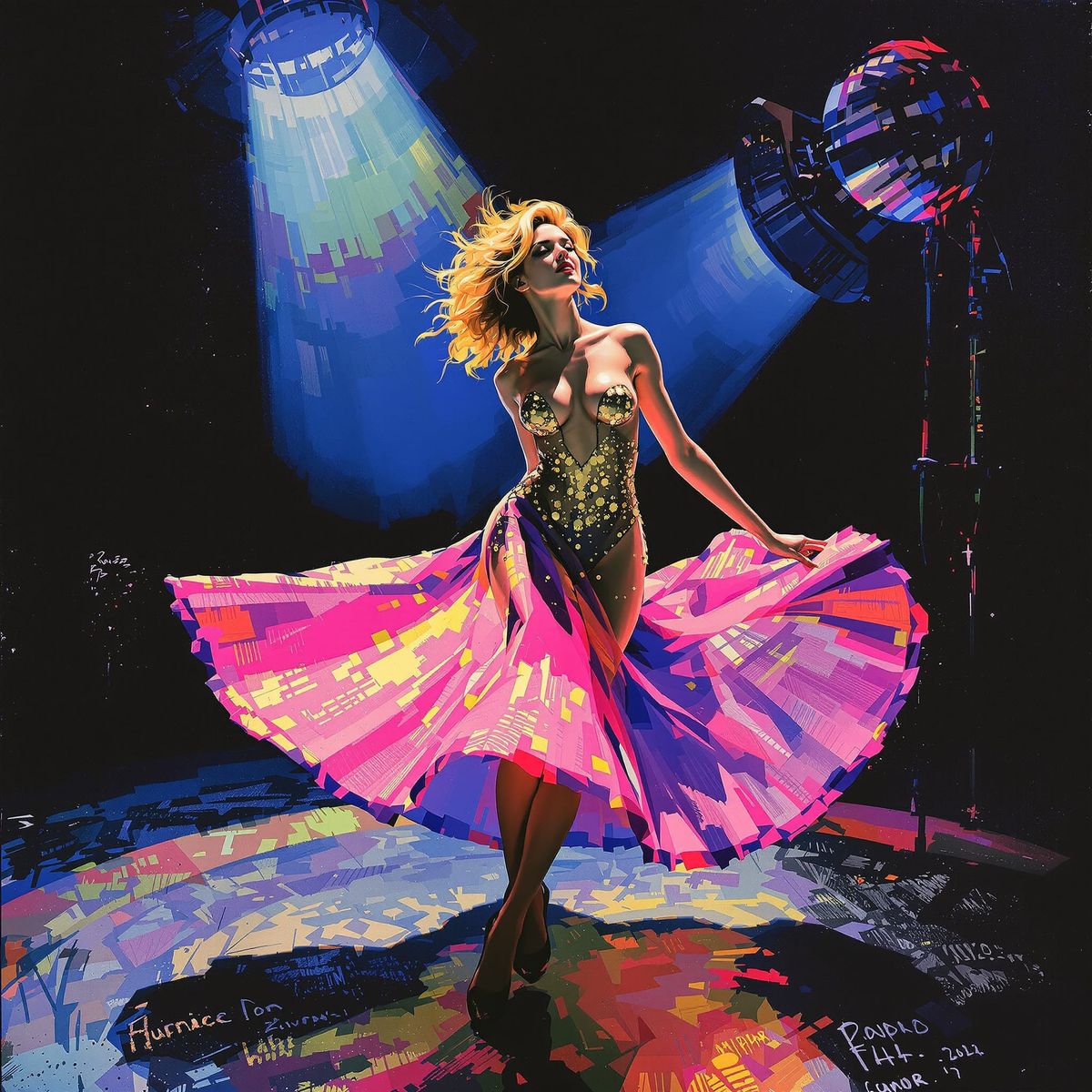 This image captures a woman spinning under golden lights at Studio 54, with sequins on her skin and a suspended laugh. Rendered with fuchsia and gold washes and gouache highlights.