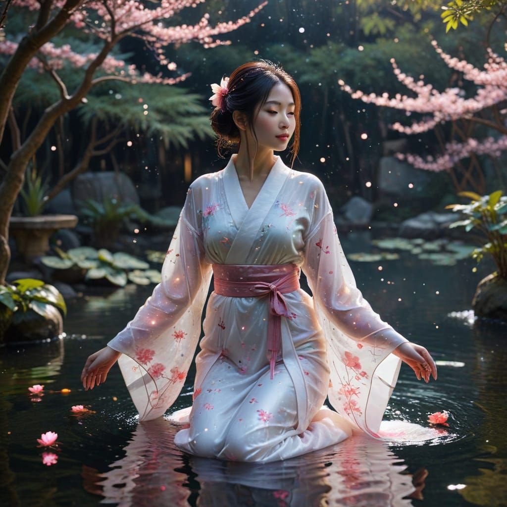 This image shows a celestial Japanese woman in a flowing white kimono with cherry blossom designs. The figure stands near a koi pond at the universe's edge, rendered as digital art.