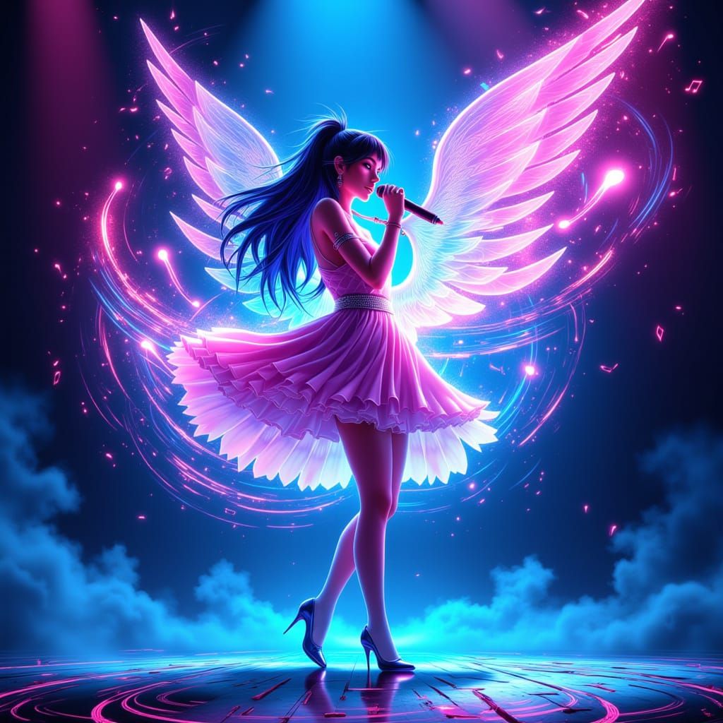 This image captures a female singer on stage, her powerful voice manifesting as luminous musical notes and symbols. The scene blends fantasy concept art with anime style, featuring bold lines and vibrant colors.