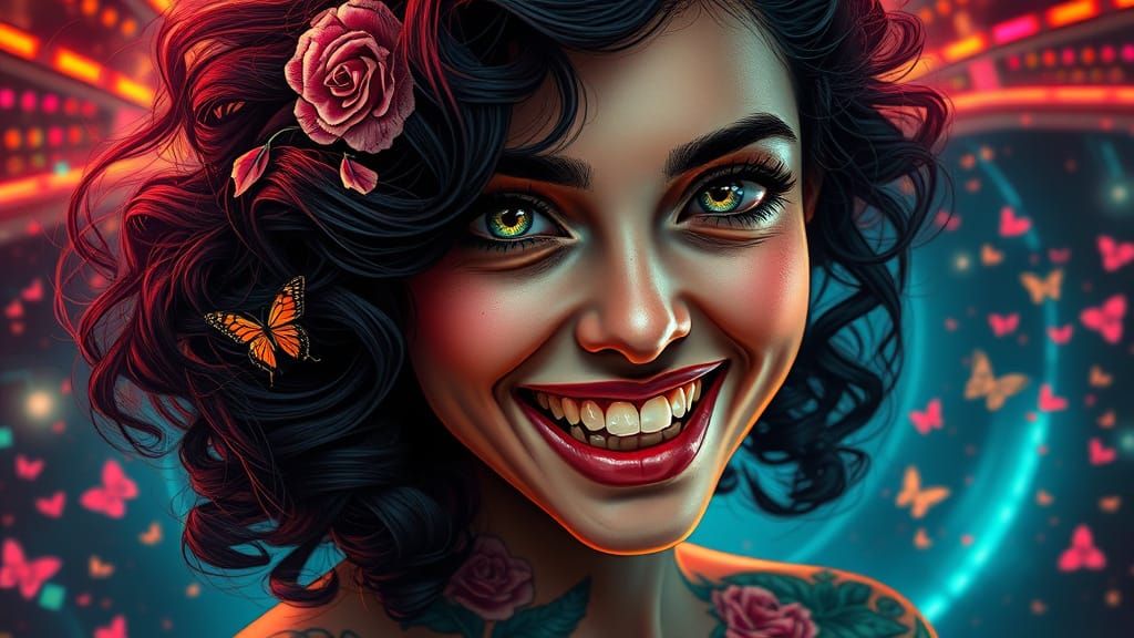 This image shows a stunningly beautiful girl in a vibrant, neon-lit scene, surrounded by butterflies and roses, with a mesmerizing glow in her eyes, blending elements of cyberpunk, glitch art, and classic painting styles.