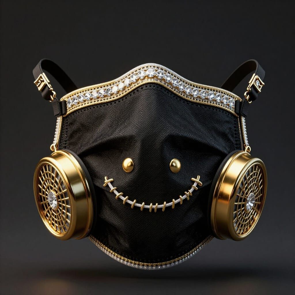 This image showcases an intricate steampunk surgical mask detailed with gold, diamonds, and a stitched smile. Featuring volumetric lighting and high detail, it has a unique circular air filter.