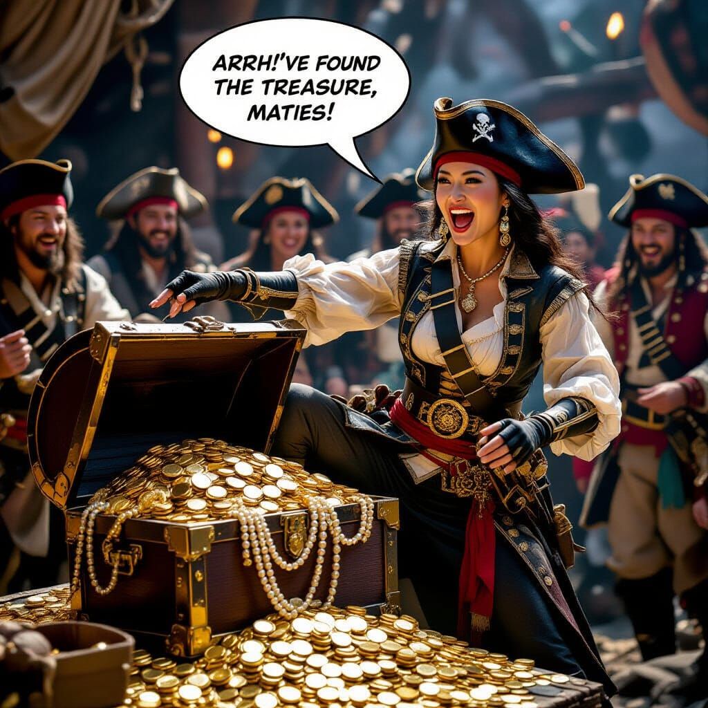 This image shows an Asian pirate triumphantly opening a treasure chest. Gold coins and jewelry spill out as her crew celebrates in a cinematic style reminiscent of classic film, with dramatic lighting.