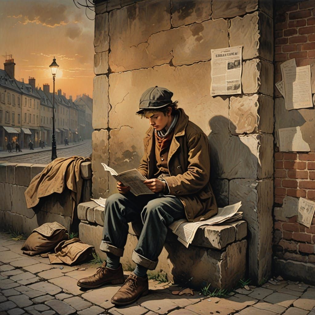 This image depicts a homeless boy in an 18th-century setting, seated against a wall while engrossed in reading a newspaper during the evening. The scene evokes a vintage aesthetic.