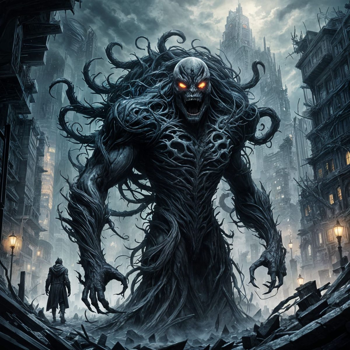 This haunting image shows a colossal, hulking symbiote ninja emerging from a desolate, post-apocalyptic wasteland, surrounded by shattered skyscrapers and eerie mist. The creature's twisted, liquid-like body glows with an otherworldly energy, casting ominous shadows across the ravaged landscape.