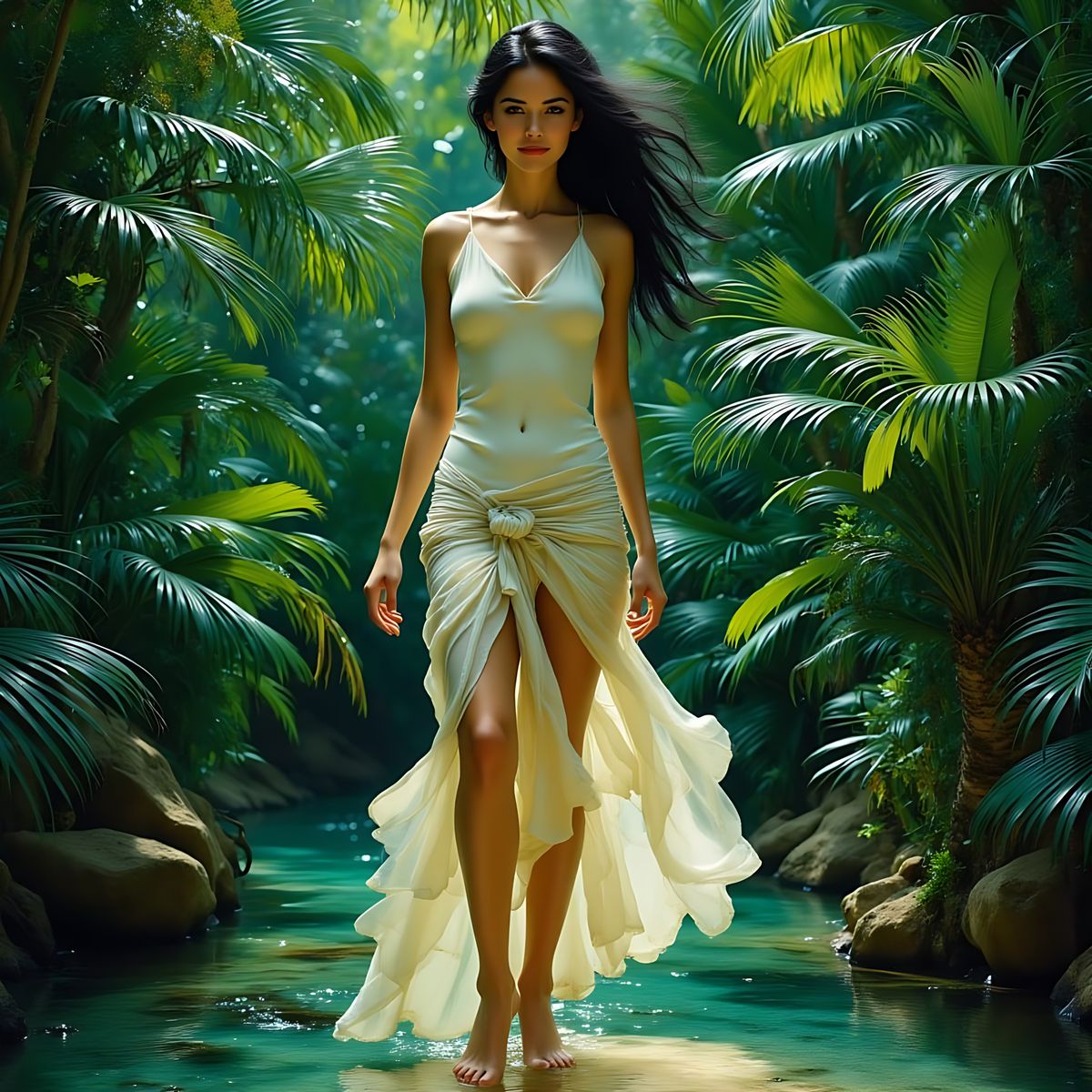 This image showcases a stunningly beautiful woman in a lush tropical setting, surrounded by vibrant foliage and vivid jewel-toned colors, blending dark elegance with sophisticated eroticism and intricate Art Nouveau details.