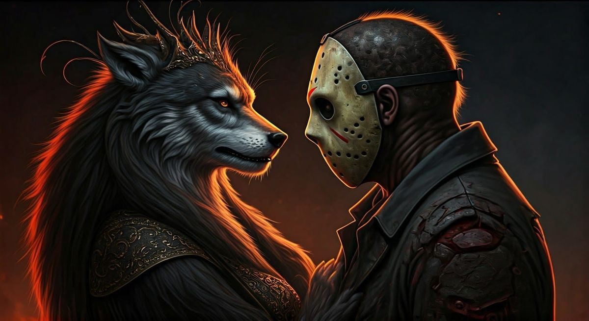 This image depicts a comical date between the Queen of the Werewolves and Jason Voorhees. The scene presents a lighthearted take on classic horror icons.