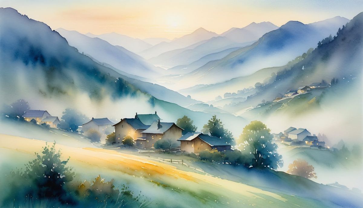 This image shows a misty mountain village at dawn, painted in an impressionist style with soft washes of color and delicate brushstrokes. It features muted blues and greens, capturing serene golden hour light.