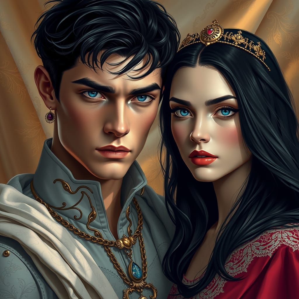 A captivating image shows an emperor and princess in a dramatic scene. Luxurious fabrics and intricate patterns enhance their regal presence, with shadows and complementary colors adding depth in a futuristic matte painting style.