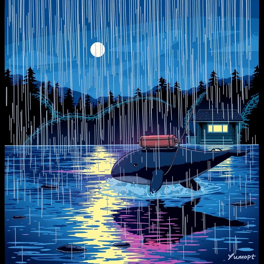 This image depicts a surreal whale under a rainy night sky, rendered in a vibrant 8-bit videogame aesthetic.