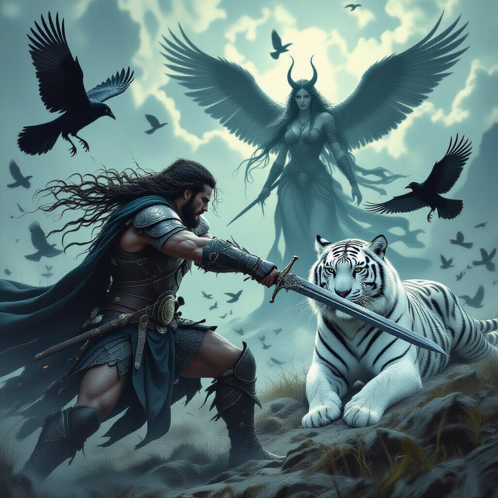 This image shows a Celtic warrior engaged in fierce sword combat, accompanied by ravens and the goddess Morrigan. A white Siberian tiger stands beside her, rendered with bold lines and ominous lighting in a dark fantasy aesthetic.
