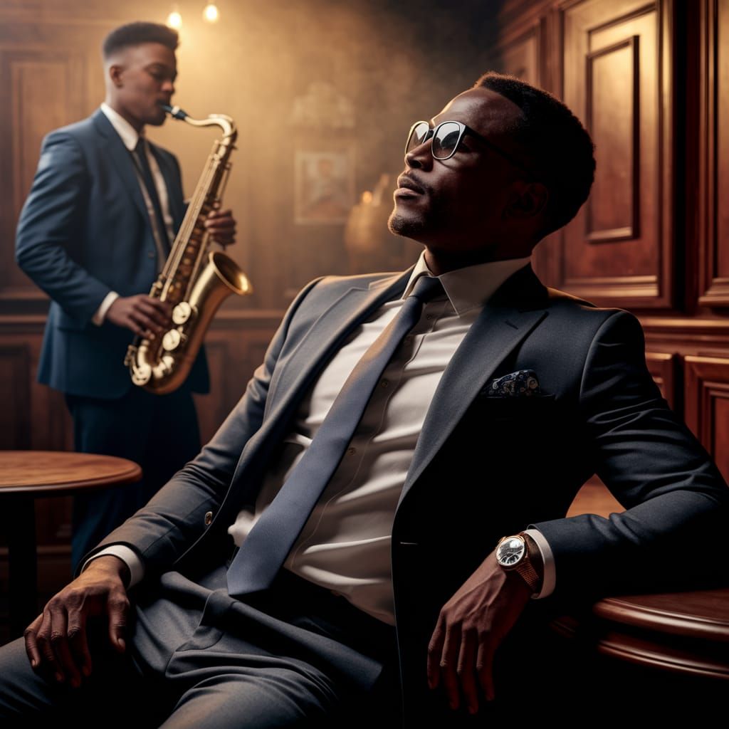 A captivating image of a stylish man in a jazz club, bathed in warm light and smoky atmosphere. The scene evokes a sense of nostalgia with rich wood tones and a soulful saxophonist playing in the background, with retro art deco elements.