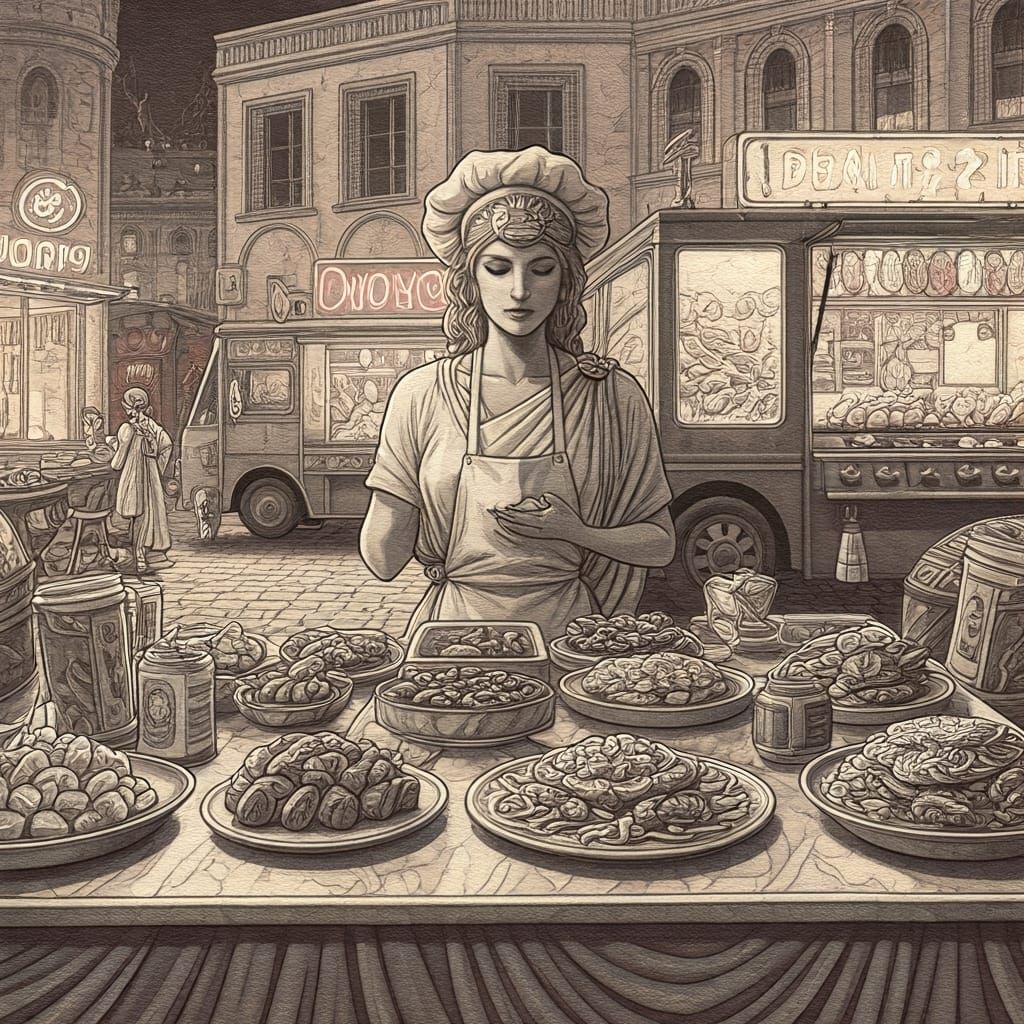 This image shows Hestia, the goddess of hearth, reimagined as a food truck manager in a pastel watercolor style. The scene blends classical elegance with modern culinary charm in monochrome hues.