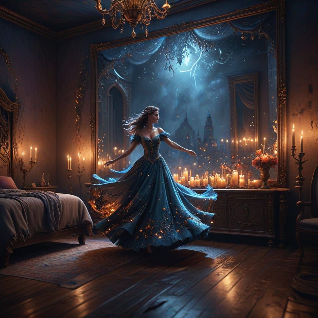 A detailed matte painting depicts a dancing woman reflected in a mirror by candlelight. Fantastical concept art with intricate details and complementary colors in 8k resolution.