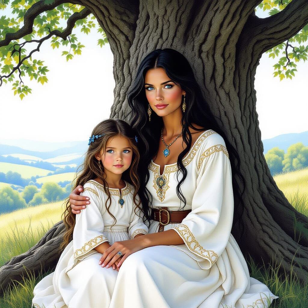 This image shows a woman with long black hair and blue eyes sitting with her daughter at the base of an old oak tree. They are wearing white medieval dresses with Celtic symbols in a mystical outdoor setting, rendered with fine textures.