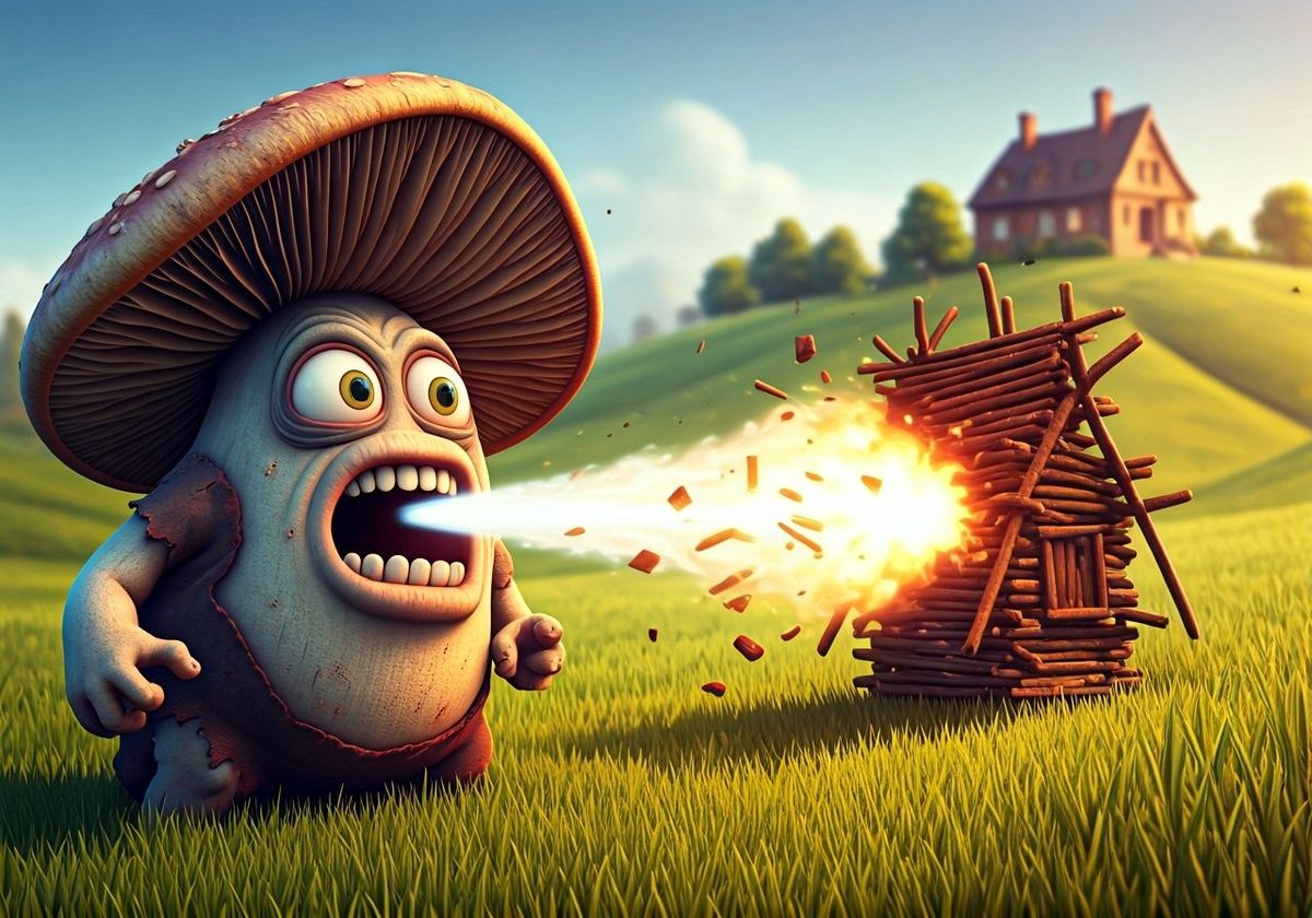 A menacing mushroom villain with expressive eyes blows down a stick house with compressed air. This image features exquisite detail in a photorealistic Disney Pixar style, blending pop-art, nuevo rocco, and cartoon elements.