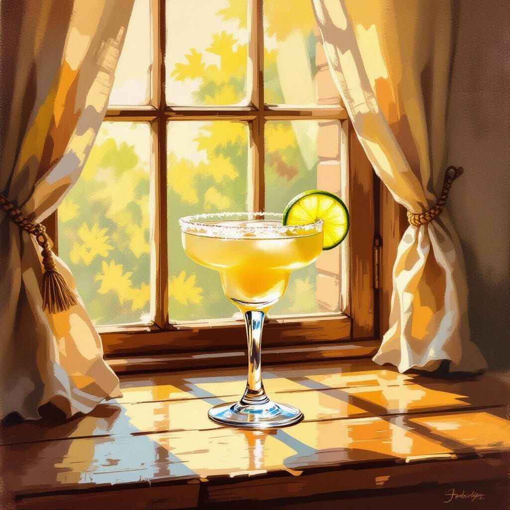 A vibrant oil painting of a margarita on a wooden table, bathed in warm light. The artwork evokes an impressionist style with thick brushstrokes and a rich, inviting color palette.