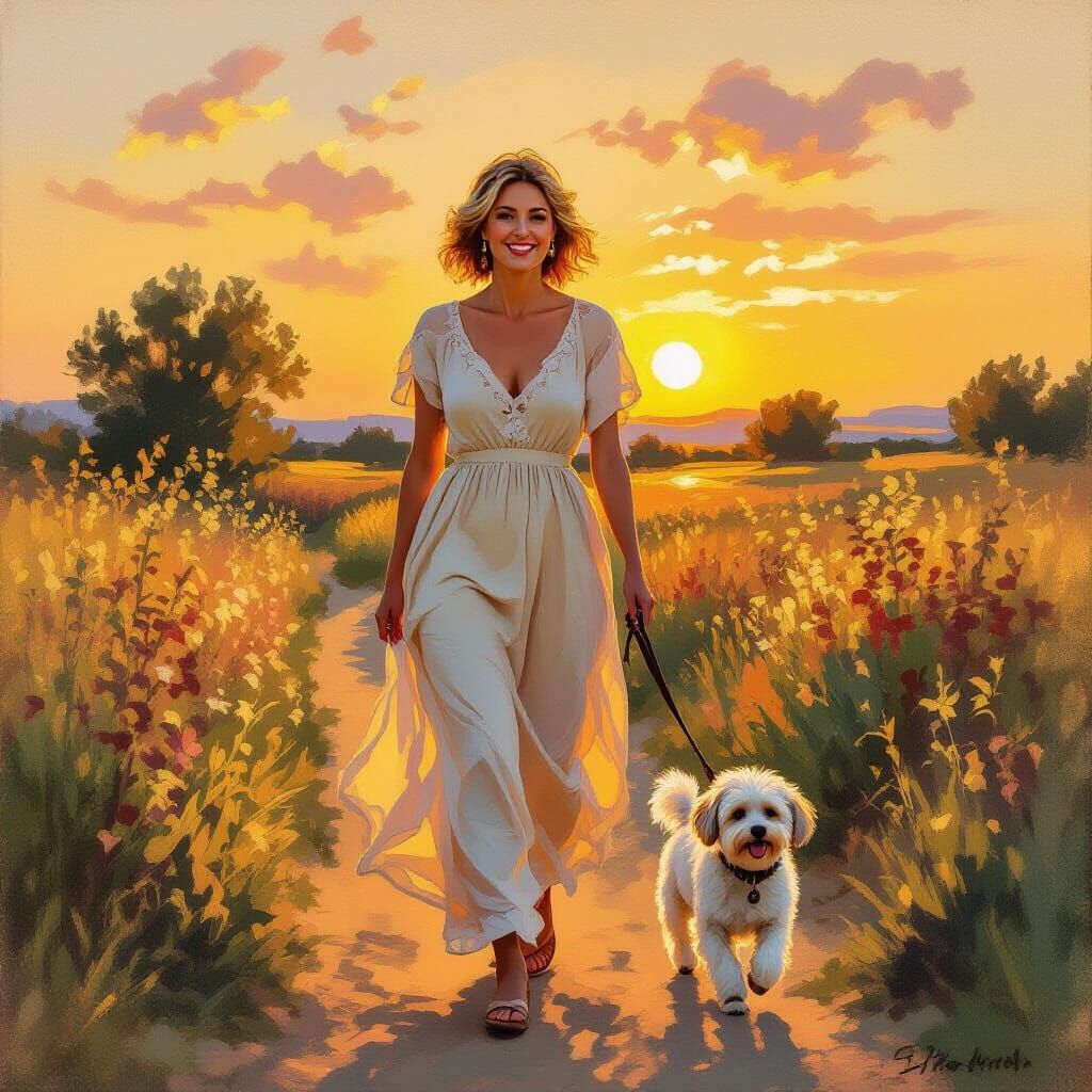This image shows a middle-aged woman with a warm smile walking a small white dog during a sunset. The scene evokes a joyful atmosphere in an impressionistic style.