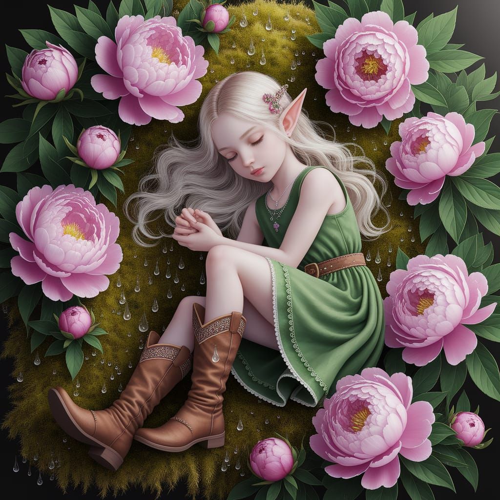 This image shows a cute elf girl in a green dress and brown boots sleeping in moss. Pink peonies and dew drops surround her in this highly detailed digital art in the style of Mark Ryden.