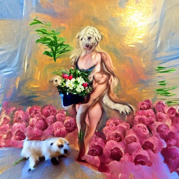 A baroque-style portrait of a proud blonde woman. She is nude and holding a bouquet of peonies. The image emphasizes the opulence and dramatic lighting typical of the Baroque period.