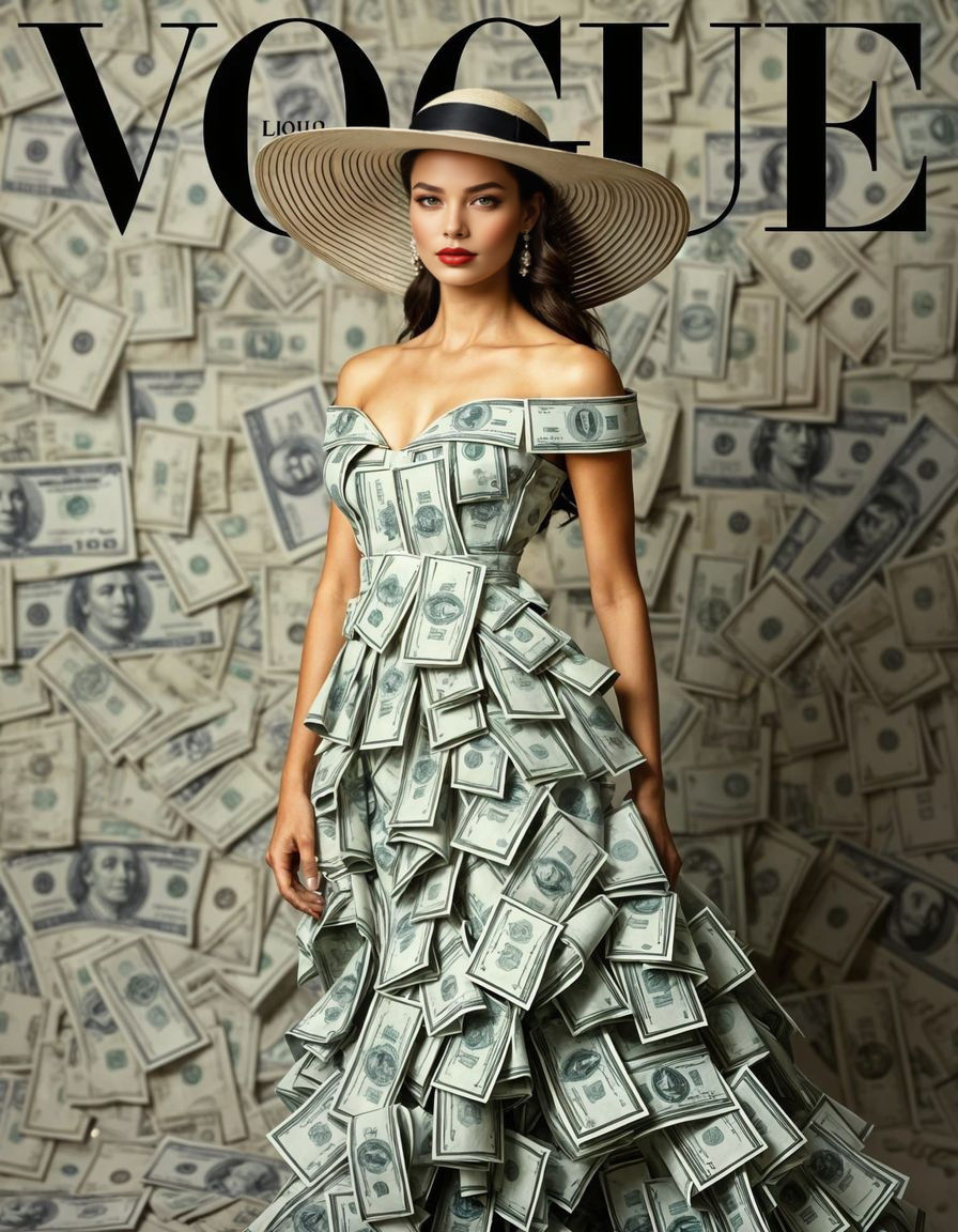 "VOGUE magazine cover. A beautiful fashion model stands wearing an off-the-shoulder gown composed entirely of paper currency, complete with a matching wide-brimmed hat. The green bills, in denominations of $1, $5, $10, $50, $100, flow across her fitted bodice and flowing skirt. Against a backdrop layered with paper currency with printed details, her confident gaze, bright red lips, and poised stance exude timeless sophistication.Black accents."
