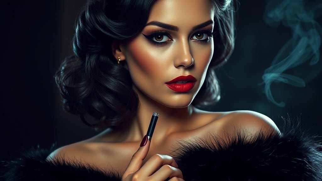 A striking portrait of a mysterious woman with dark retro waves and seductive eyeliner, draped in fur. Features dramatic film noir lighting and rich triadic colors for a high-fashion look.