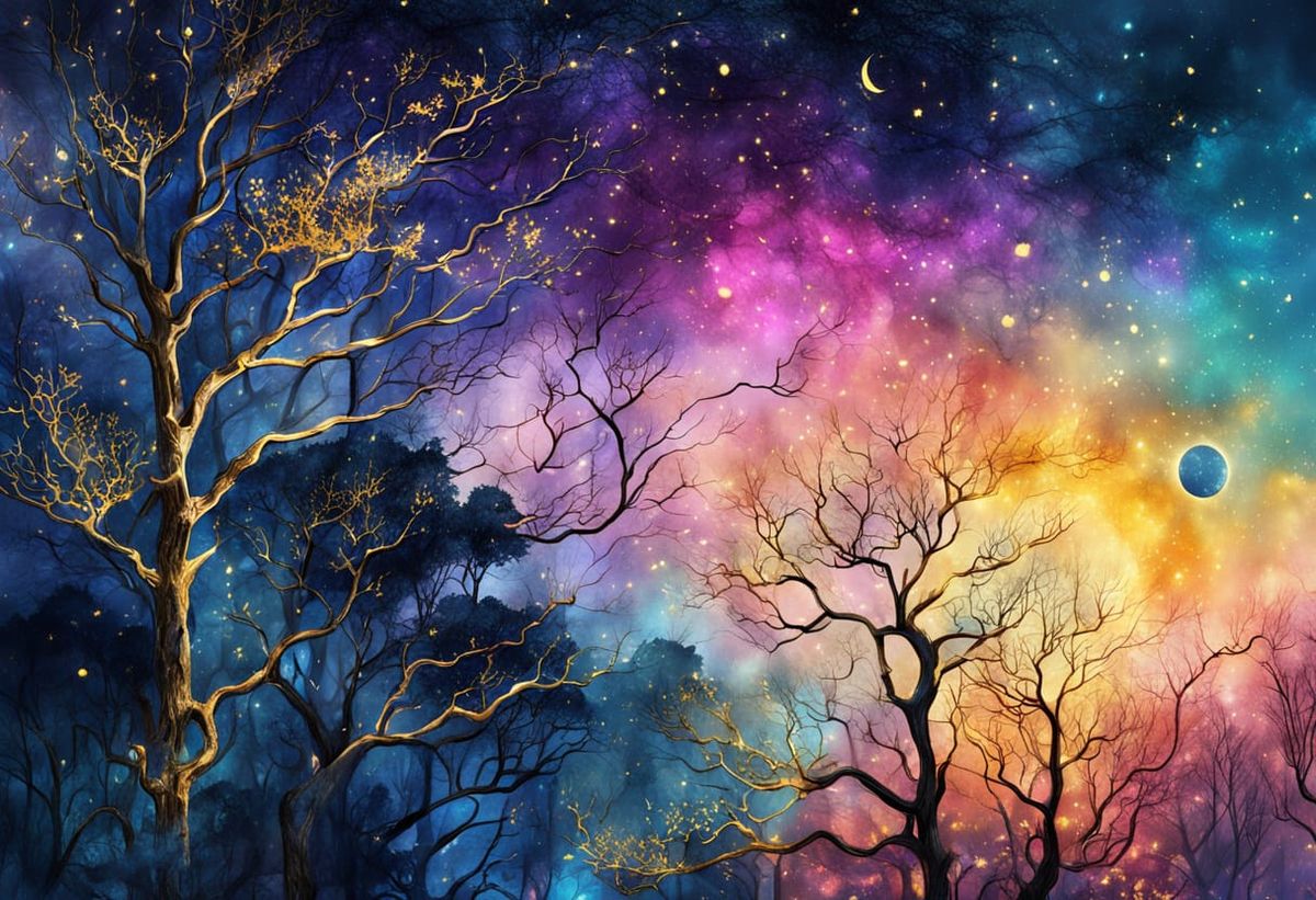 This image showcases a surreal, starry forest bathed in moonlight, featuring delicate gold outlines and luminous accents. Rendered in a Chinese watercolor style with twilight colors.