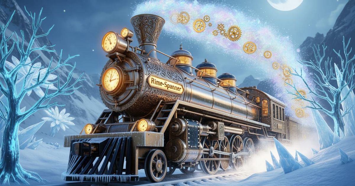This image shows a detailed steampunk train, the 'Rime-Spanner', moving through a snow-covered valley with giant ice flowers. It exhales frost and light, captured with cinematic lighting in a photorealistic style.
