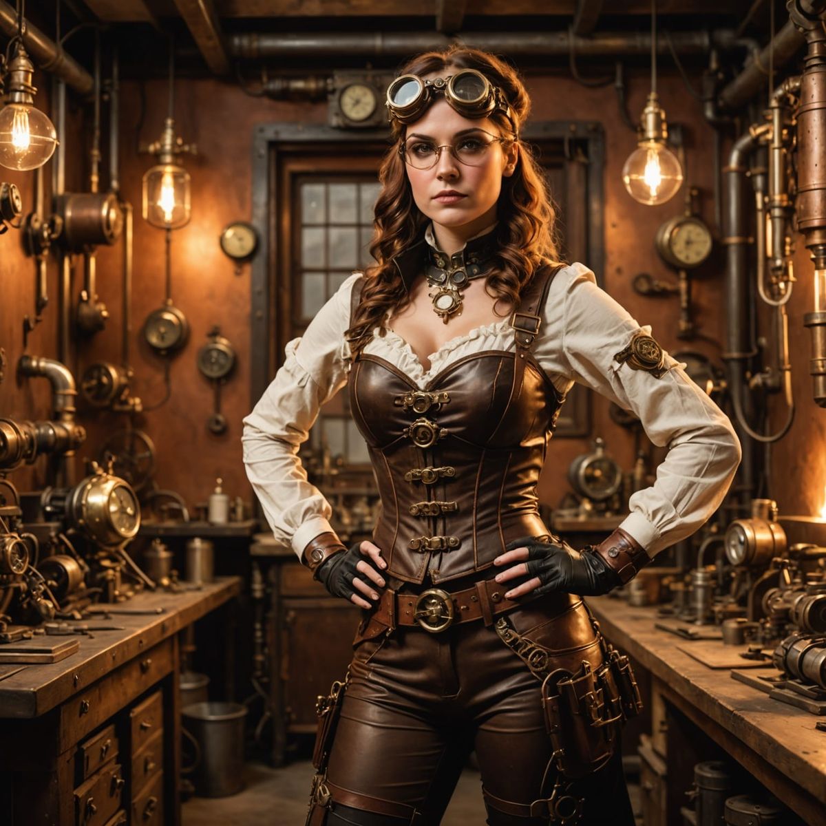 This image shows a woman dressed as a steampunk engineer in a workshop. The outfit features brass goggles and a leather corset, set against warm copper tones.