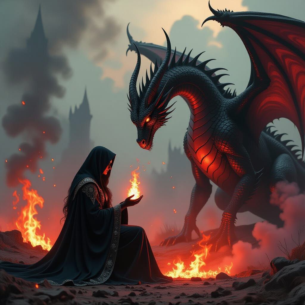 A surreal image shows Lucifer, in dark clothing, kneeling in a hellish landscape, giving birth to a queen dragon amid fire. The image is rendered in a dark, gothic romantic style.