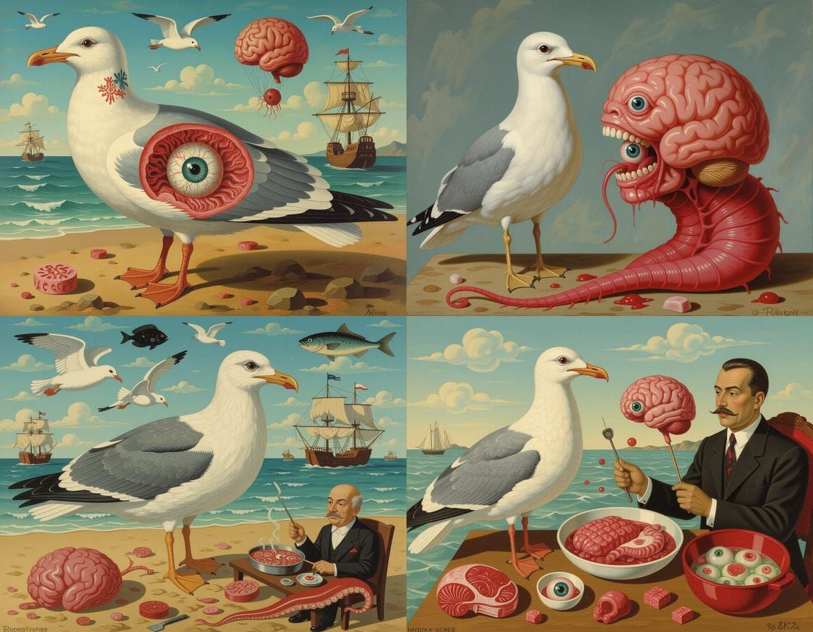 This image depicts a grotesque mutant chimera formed from various animal parts and internal organs. The artwork evokes the surrealist style and anatomical detail reminiscent of classic surrealist painting.
