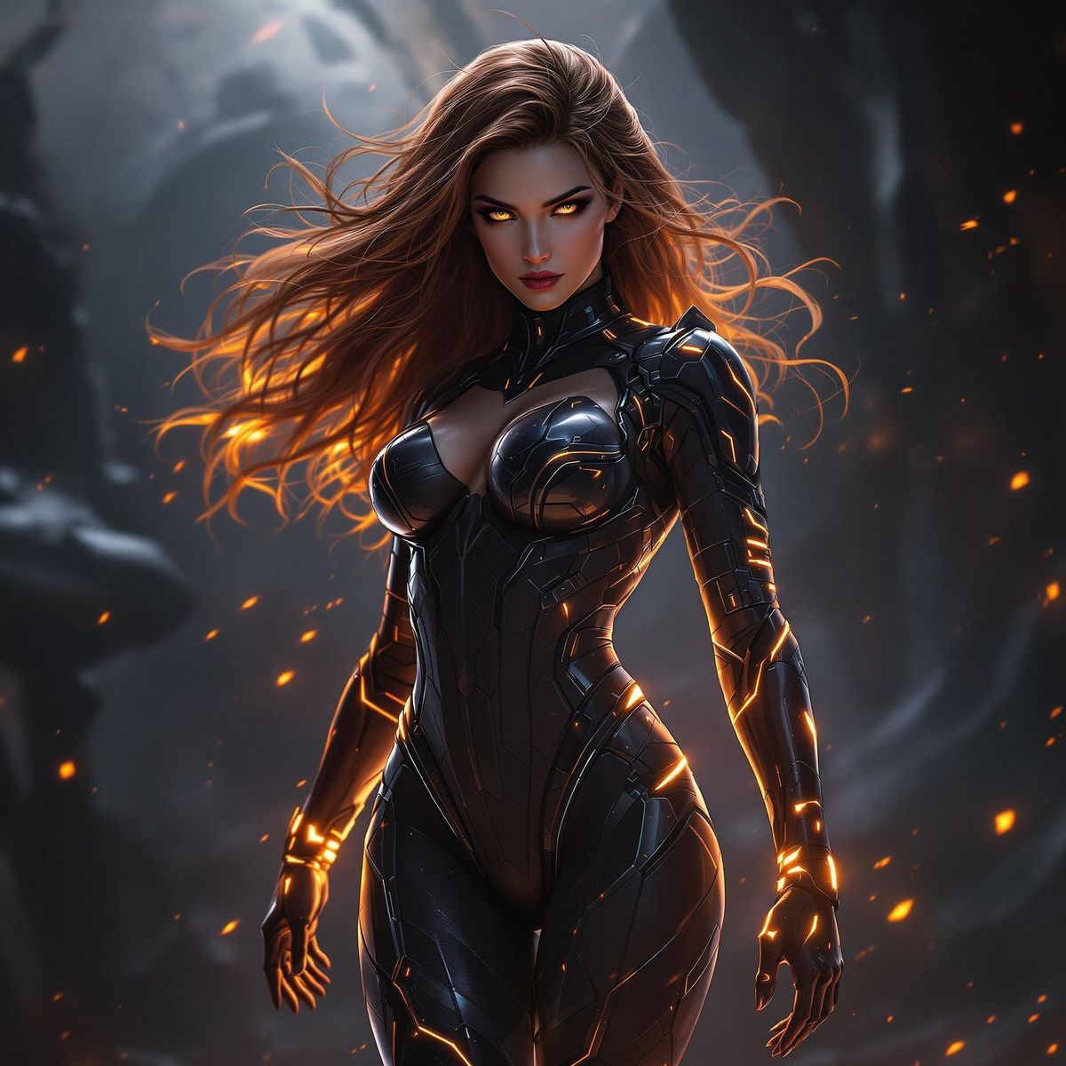 This stunning concept art features a beautiful warrior, Starfire, clad in a sleek bodysuit, with a shy expression and athletic physique, set against a dark science fiction backdrop with intricate textures and dynamic lighting, reminiscent of Alphonse Mucha's elegance and Jordan Grimmer's gritty aesthetic...