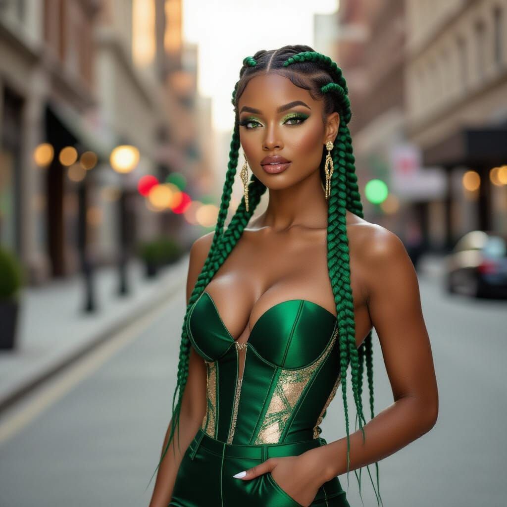 This image features a radiant Black woman with striking blue and green braids, posing in a jewel-toned corset. The scene captures an editorial fashion influencer aesthetic with cinematic lighting.