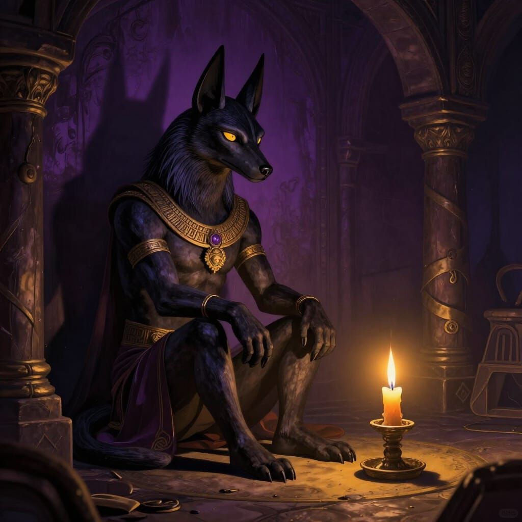 This image shows Anubis, the jackal-headed god, in a dimly lit antechamber, awaiting divine judgment. Rendered in a dark fantasy concept art style with dramatic lighting and deep colors.