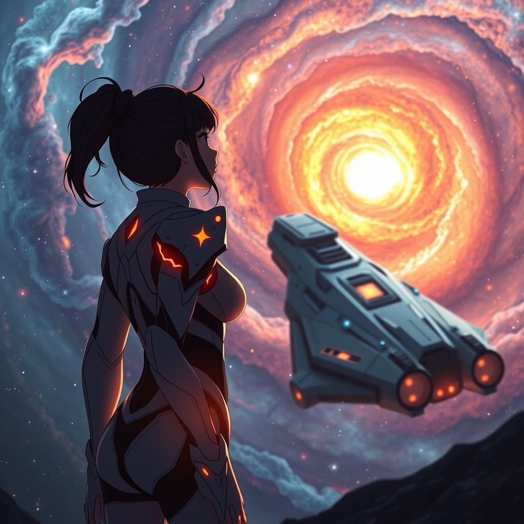 A striking image of a futuristic anime warrior gazing out at a vibrant nebula, set against a backdrop of cosmic wonder and illuminated by the soft glow of her armor. Rendered in hyper-realistic anime style with meticulous attention to detail.