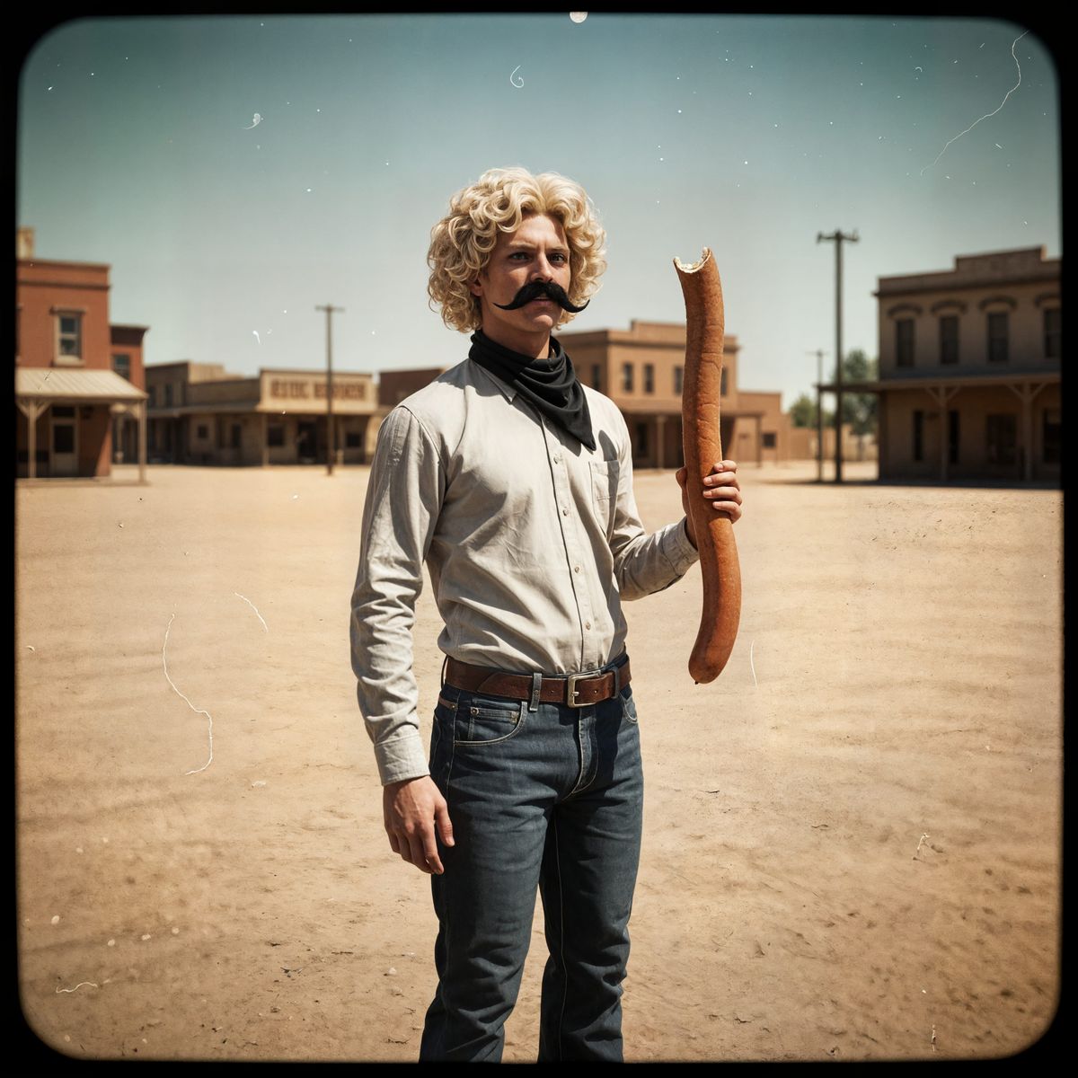 This image captures a sun-bleached, vintage photograph of a lone cowboy in a deserted town. Rendered with gritty old film texture, it features subtle desaturation and sepia tones for a lost Americana feel.
