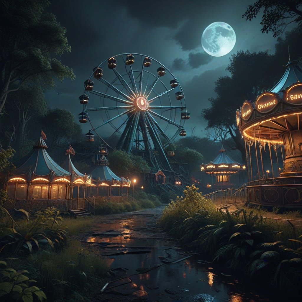 This image presents a detailed matte painting of an abandoned, overgrown amusement park on a spooky night. The artwork features deep colors and intricate details, creating a dramatic and atmospheric fantasy concept.