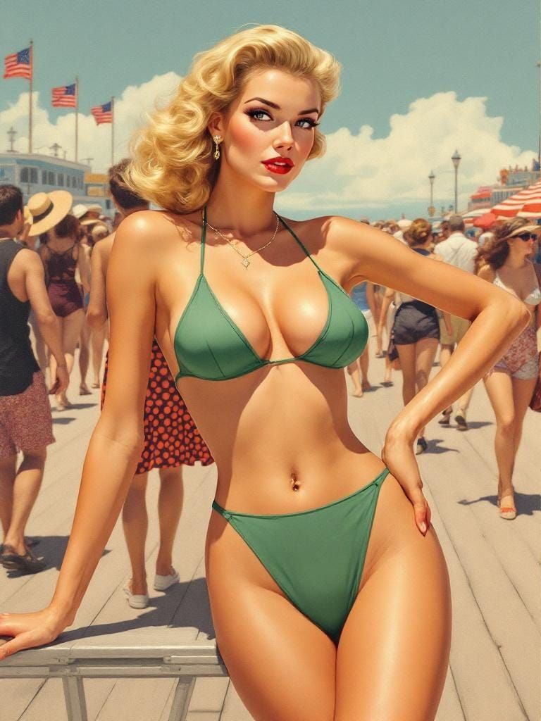 A striking picture of a 1950s pin-up woman posing on a crowded boardwalk. The artwork uses simplified curved forms and flat color blocking in a vintage poster style.