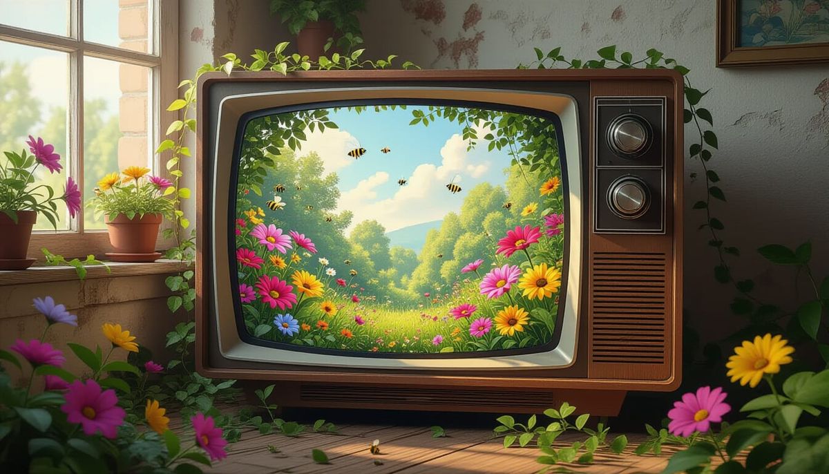 A striking picture of a vibrant garden flourishing within an old television. This image captures the fusion of retro technology and botanical art, depicting life and growth in an unexpected setting.