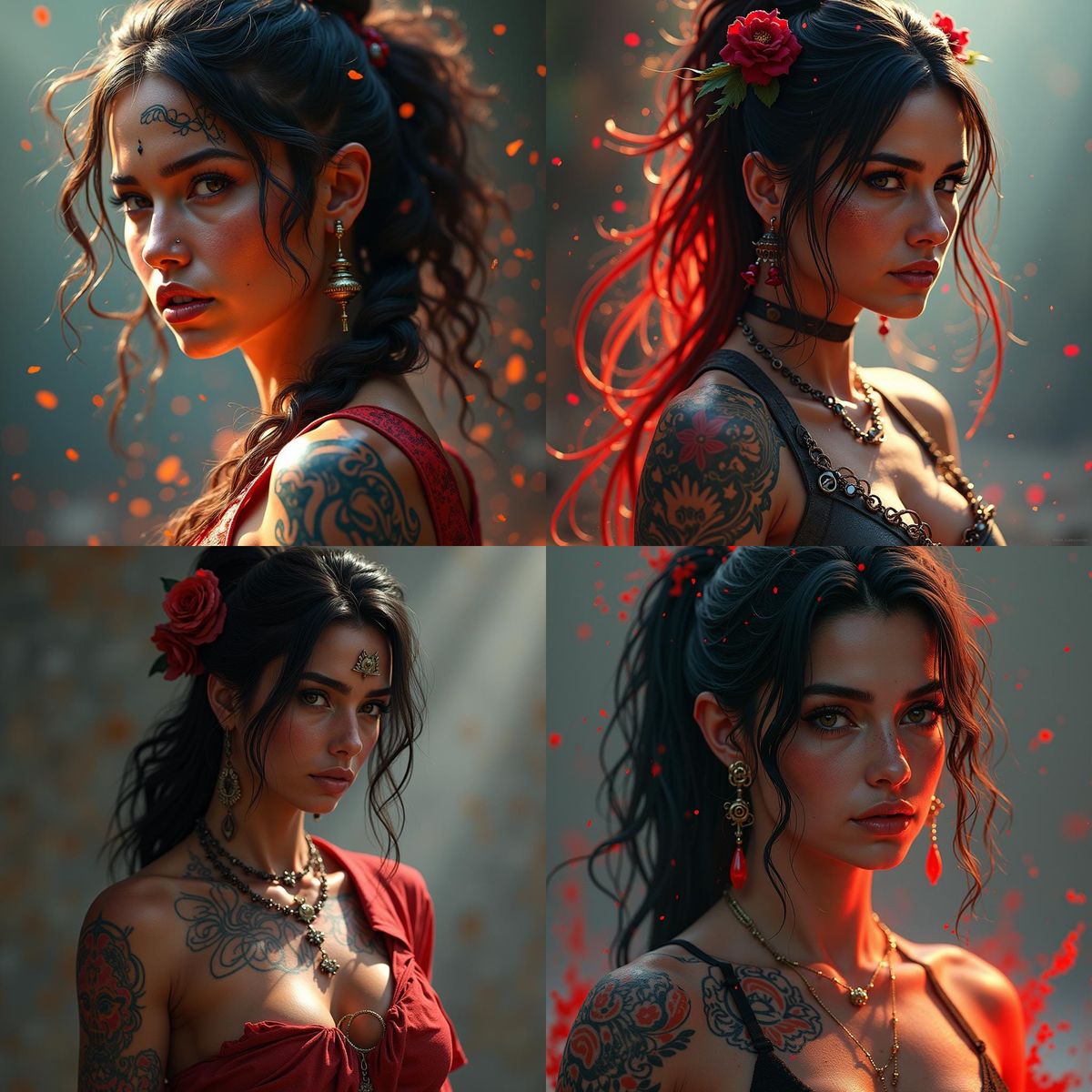 A hyperdetailed portrait of a tattooed Latina warrior woman. The digital art features dynamic lighting and intricate details in a triadic color scheme, reminiscent of Artstation trends.