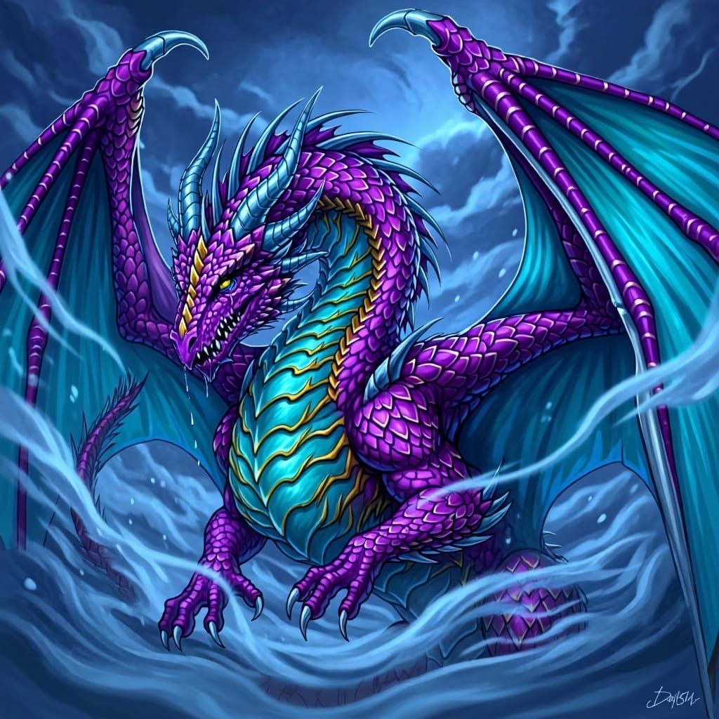 A vibrant dragon with shimmering scales undergoes a magical transformation. This digital painting blends fantasy elements with a painterly aesthetic, showcasing swirling mist and dynamic colors.