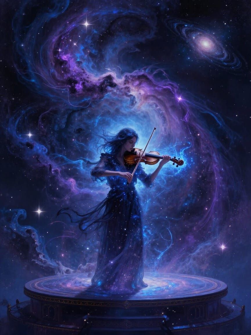 This image depicts a lone violinist performing on a stardust stage amidst swirling nebulae and galaxies. The musician's instrument emits cosmic energy, highlighted by dramatic lighting. Rendered as a digital painting with ethereal, dreamlike qualities and vibrant blues and purples.